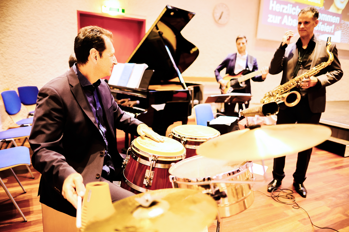 Beim reichhaltigen Apéro konnten alle auf ihren Erfolg anstossen und sich was Gutes zum Essen gönnen. Die Feier wurde wieder mit toller Musik begleitetet. Dieses Mal brachte Costi Topalidis seine Gruppe «Heridos de Sombra» mit. Vier Vollblut-Musiker, die der Feier einen wunderbaren Touch verliehen.