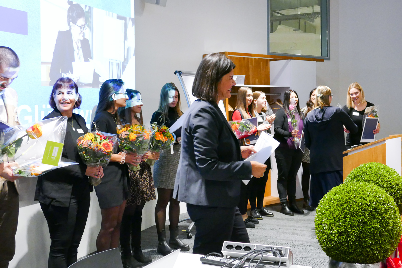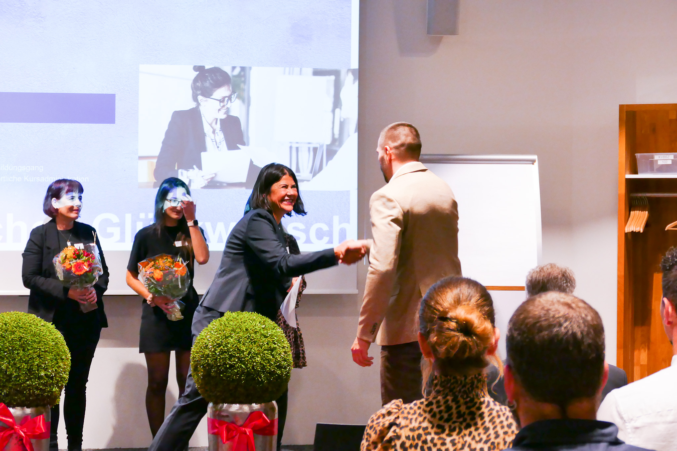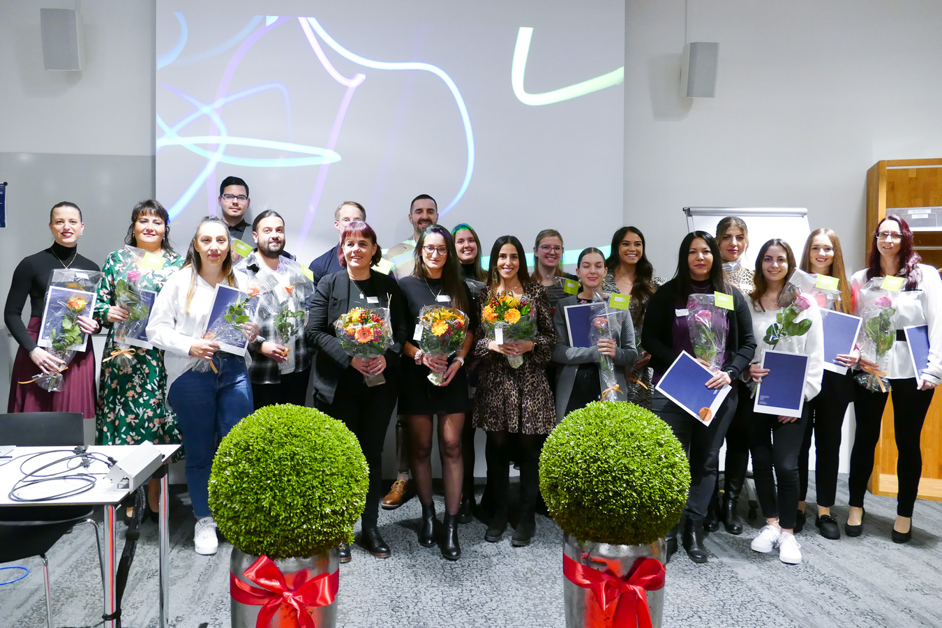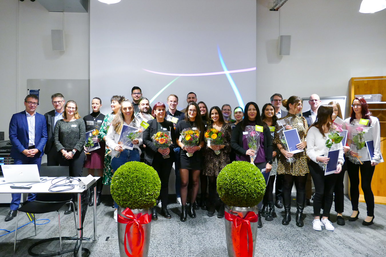 Im Anschluss durften alle ihr Zertifikat und eine Rose abholen und dann gemeinsam auf den Erfolg mit einem Glas Prosecco anstossen. Die Stimmung am Apéro war freudig und ausgelassen.