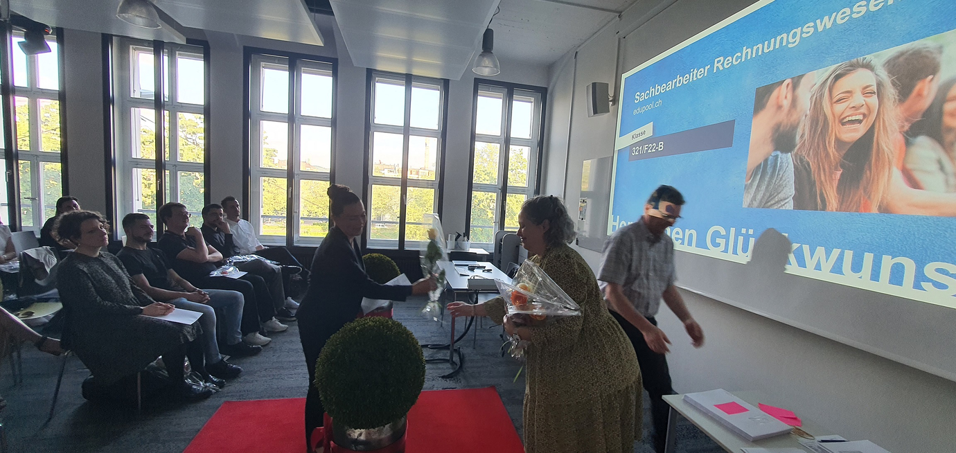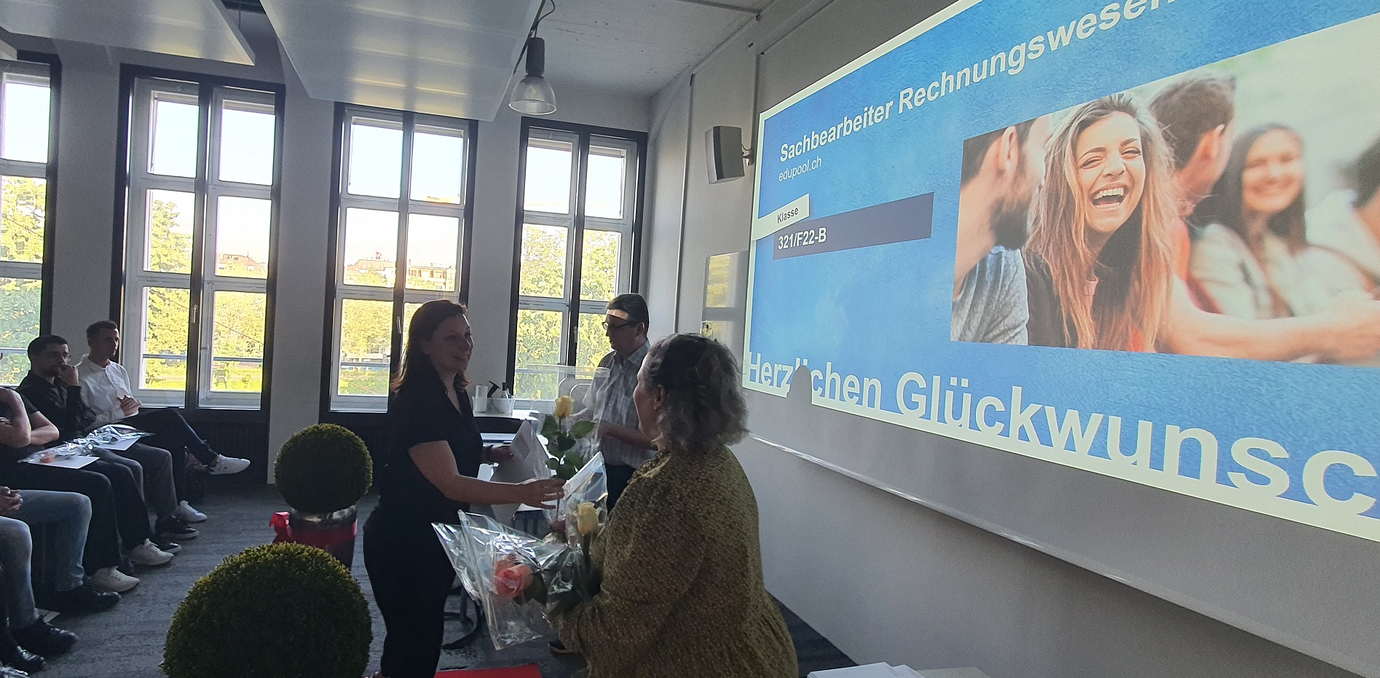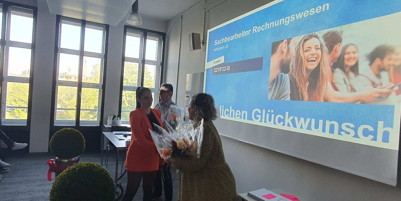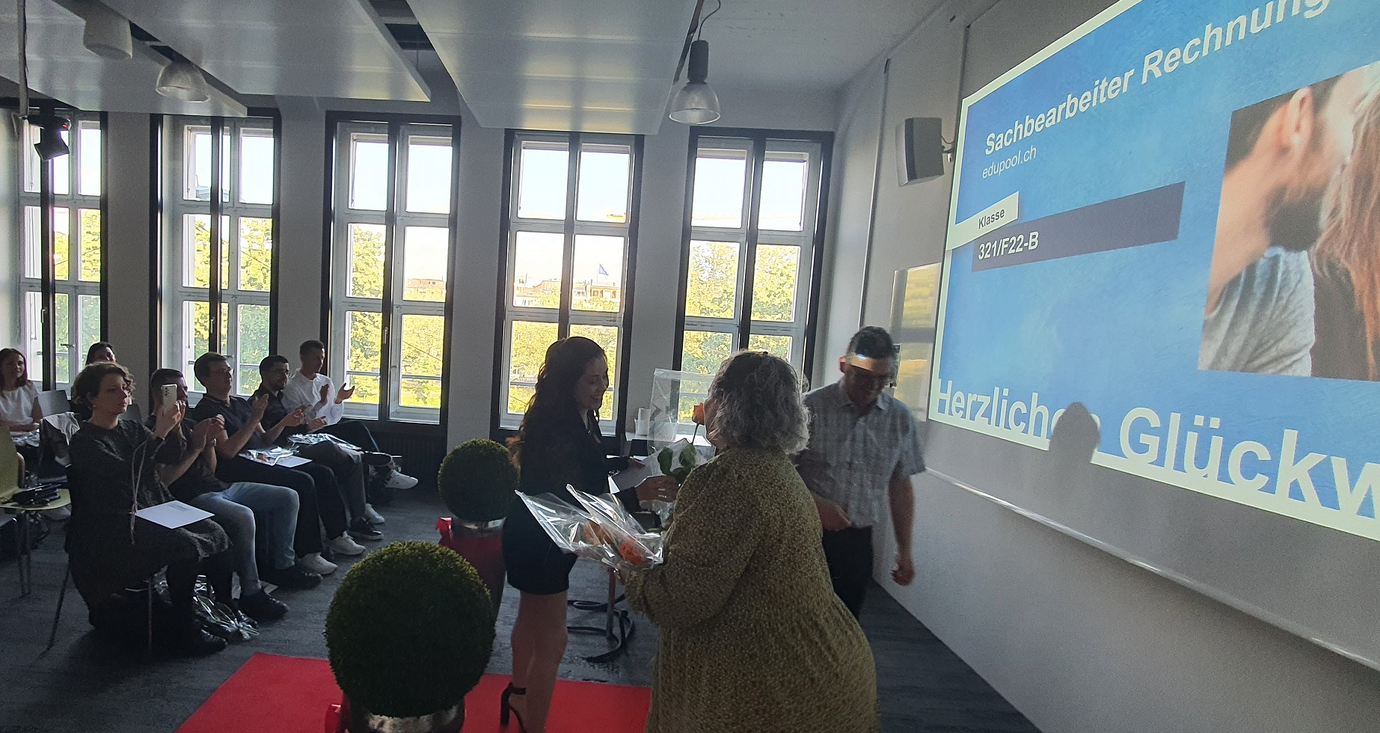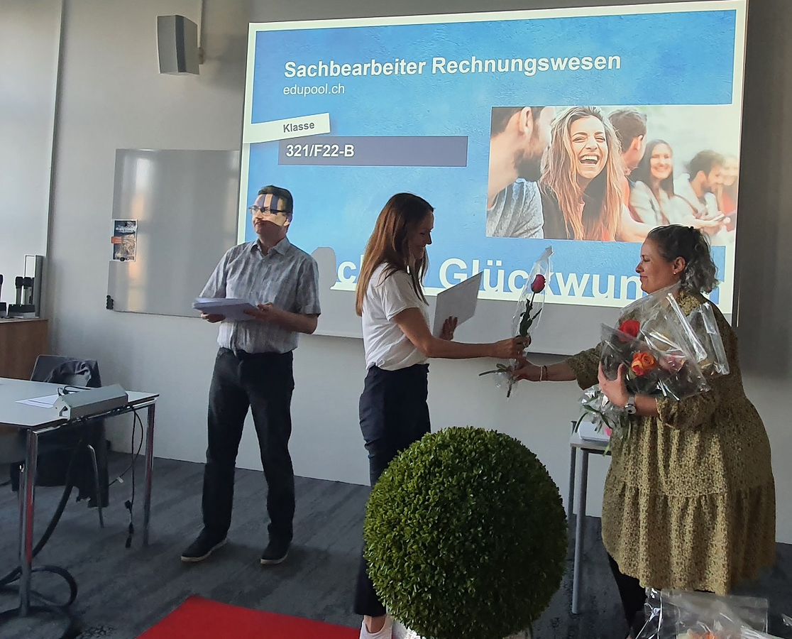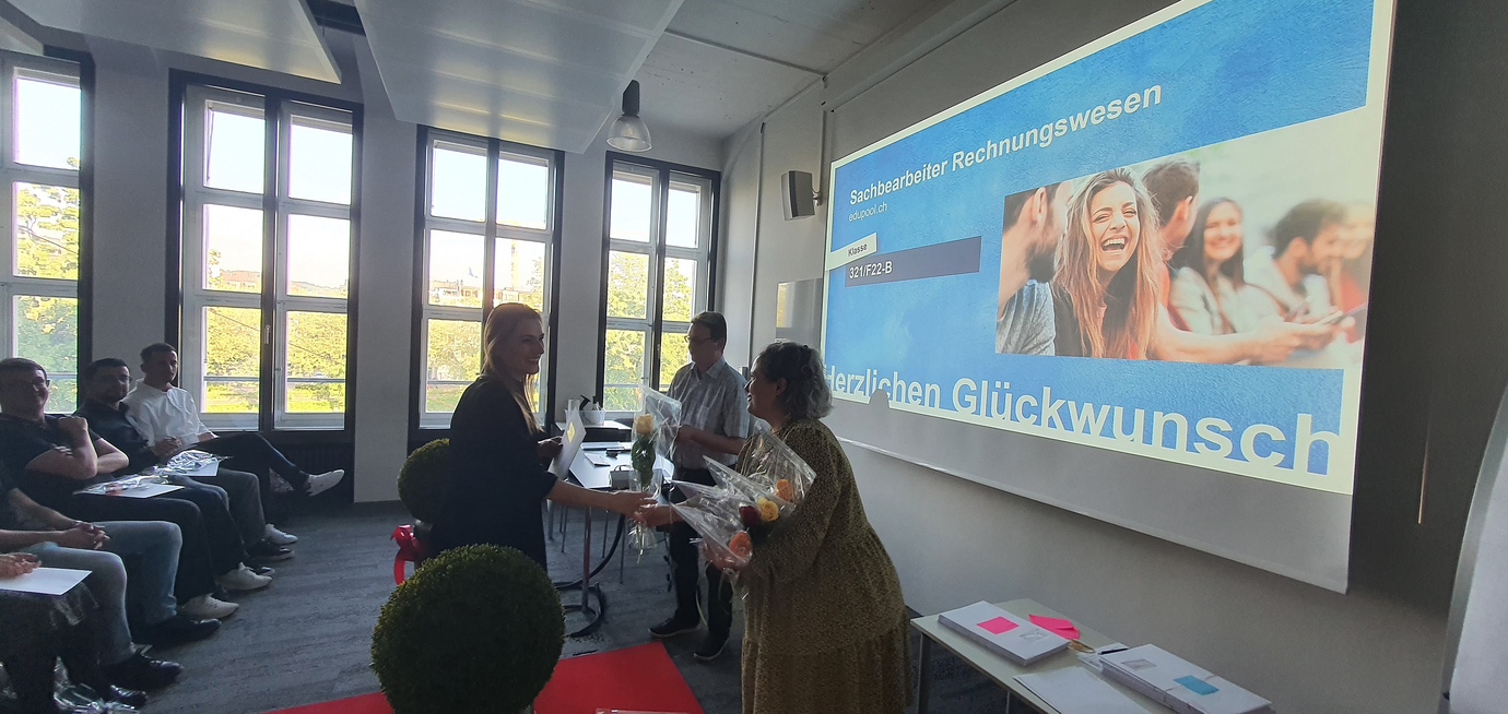 Die erfolgreichen Abschlüsse gehen weiter! Am letzten Freitag durften die Absolventinnen und Absolventen des Lehrgangs Sachbearbeiter/-in Rechnungswesen edupool.ch an der Abschlussfeier das Diplom entgegen nehmen. Auch bei diesem Lehrgang verzeichnen wir national wieder einen Erfolg: Rang 1 und 2 wurden mit der Note 6 durch 2 ehemalige Studierende von uns belegt.