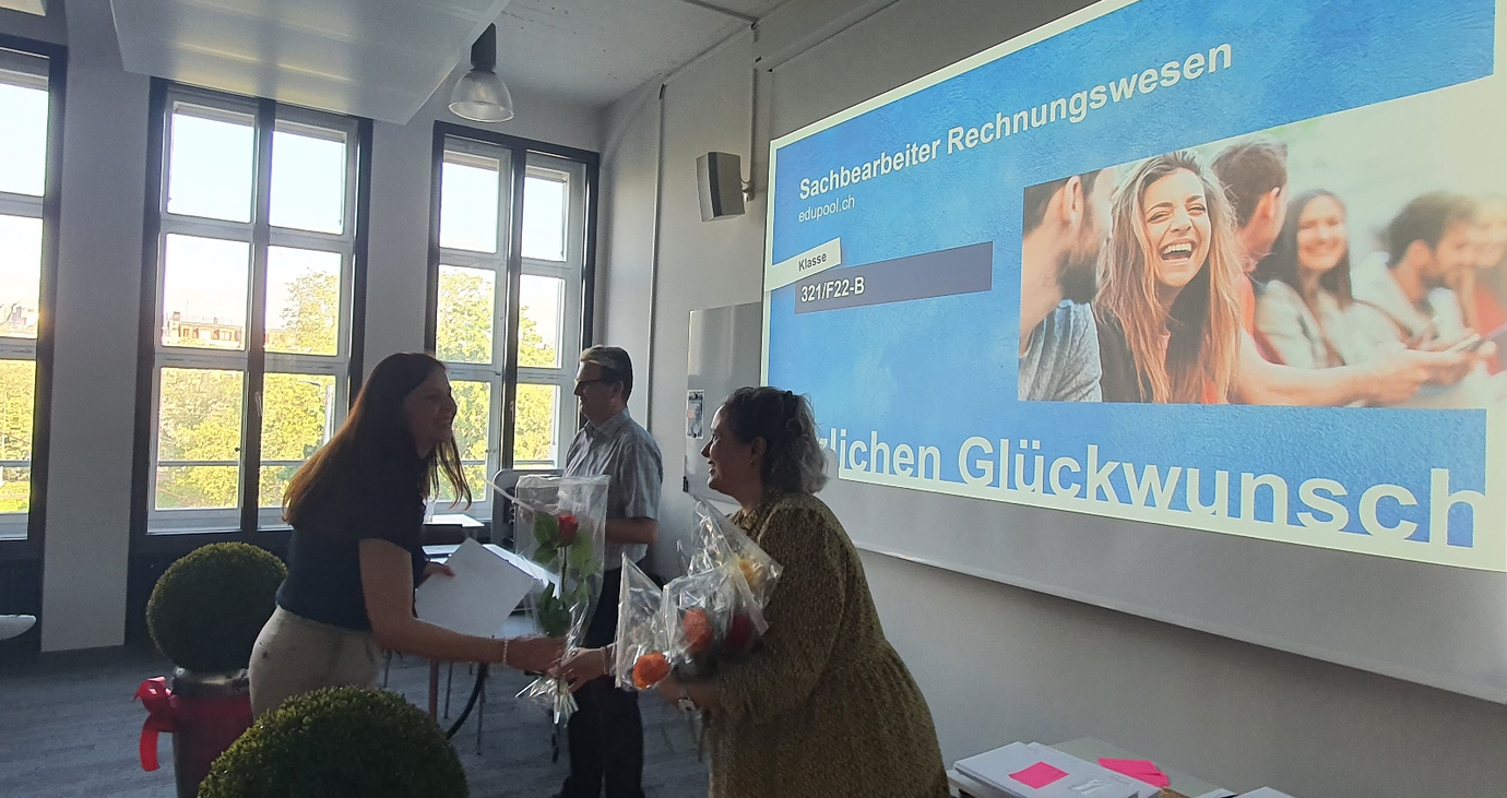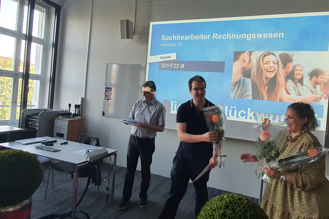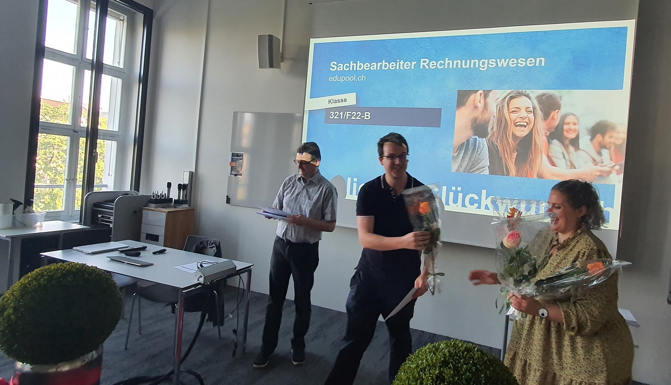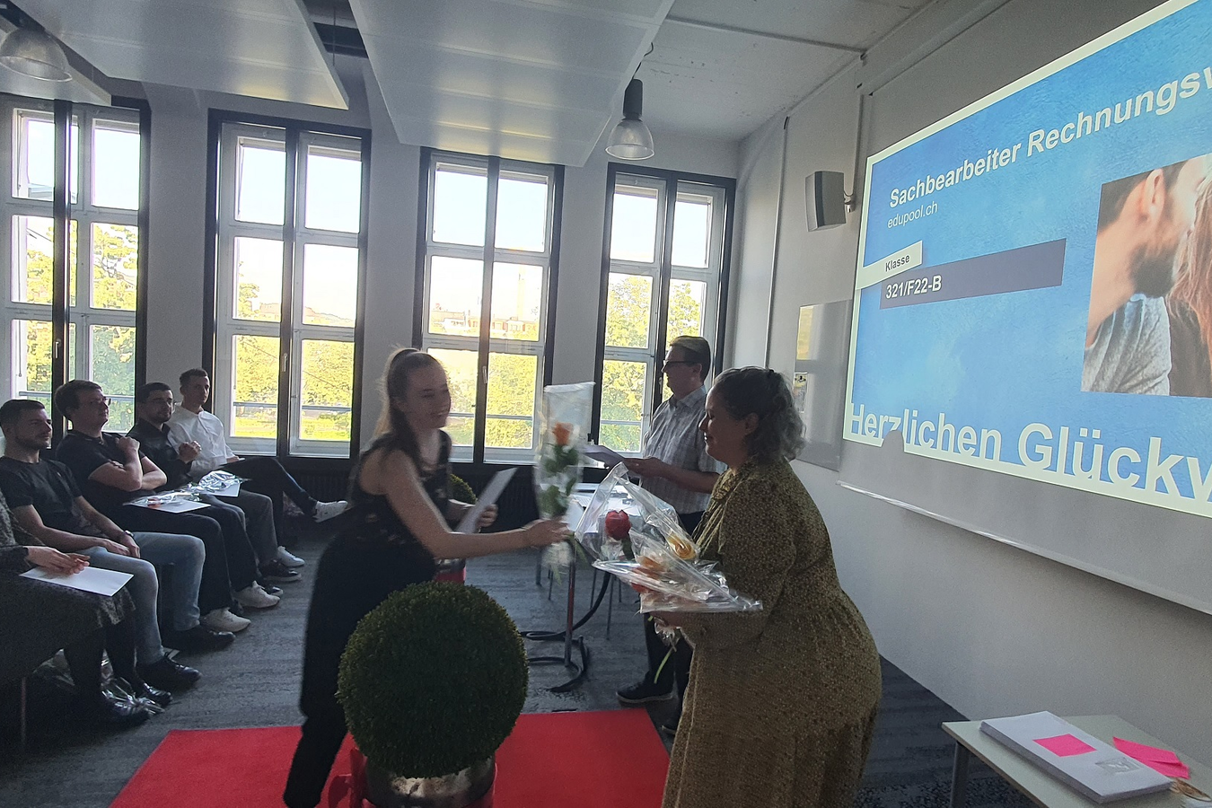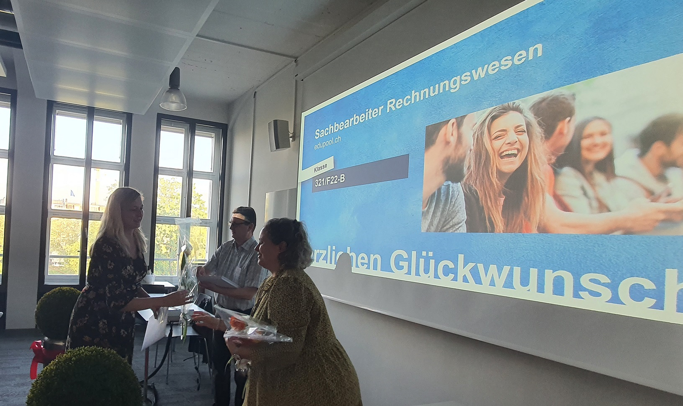 Die erfolgreichen Abschlüsse gehen weiter! Am letzten Freitag durften die Absolventinnen und Absolventen des Lehrgangs Sachbearbeiter/-in Rechnungswesen edupool.ch an der Abschlussfeier das Diplom entgegen nehmen. Auch bei diesem Lehrgang verzeichnen wir national wieder einen Erfolg: Rang 1 und 2 wurden mit der Note 6 durch 2 ehemalige Studierende von uns belegt.