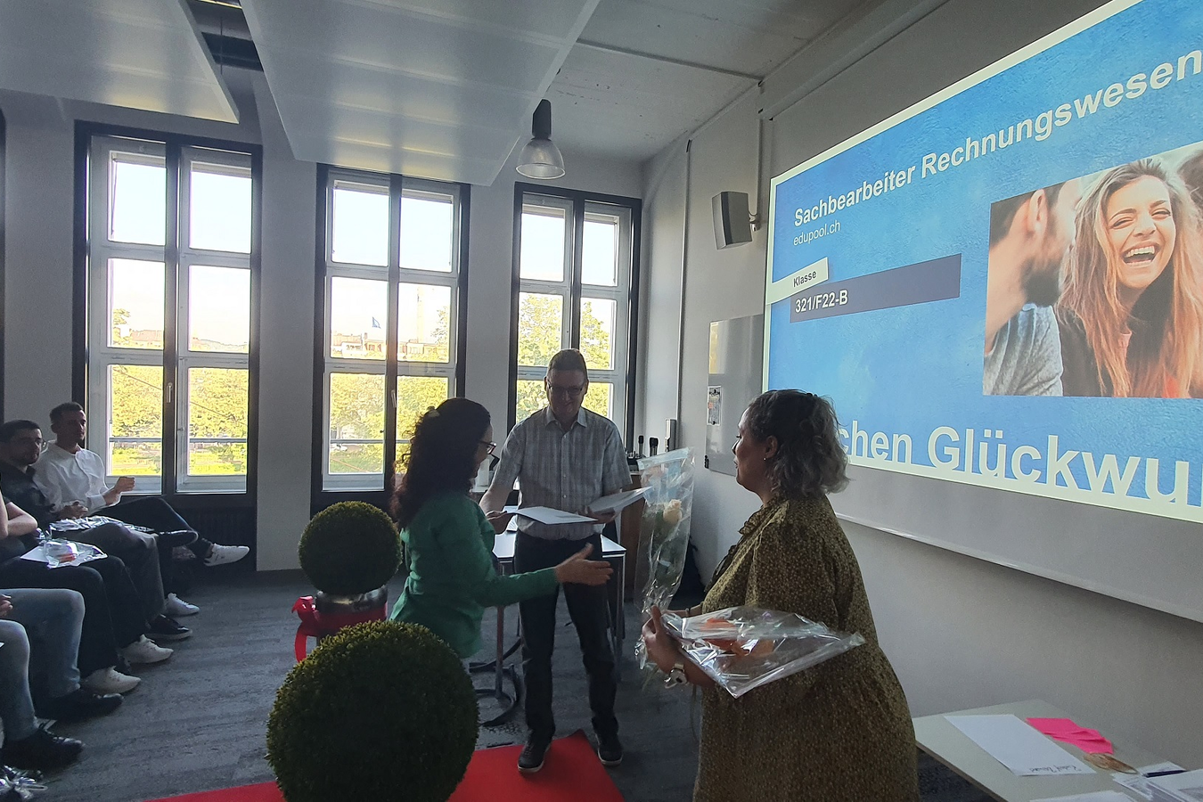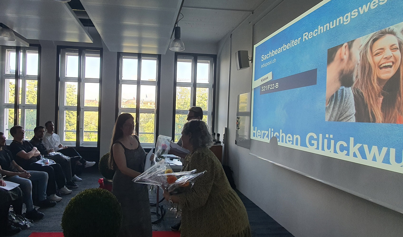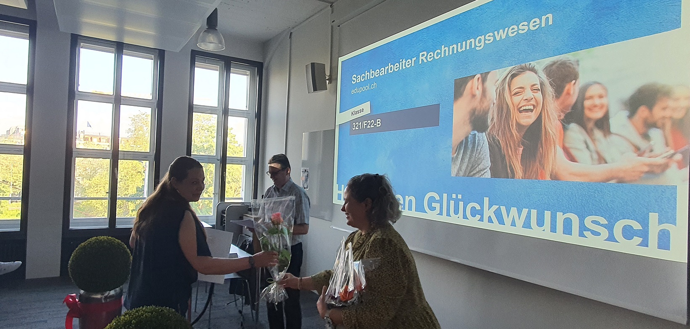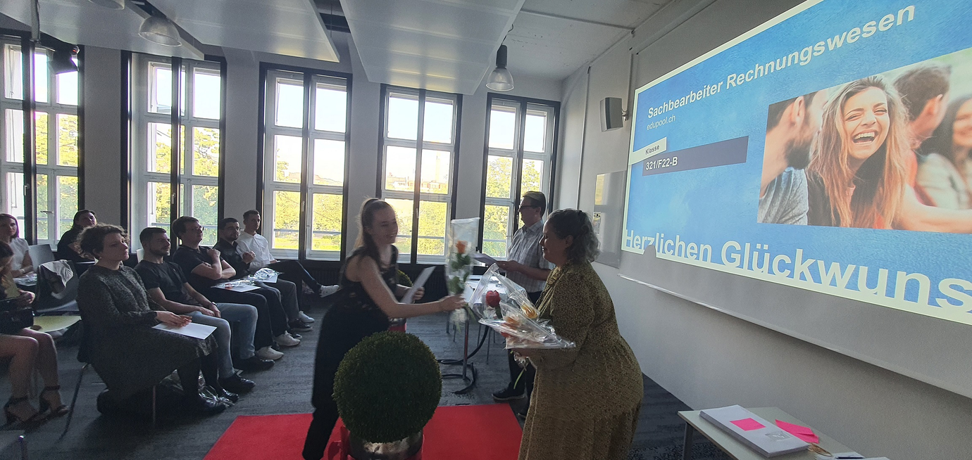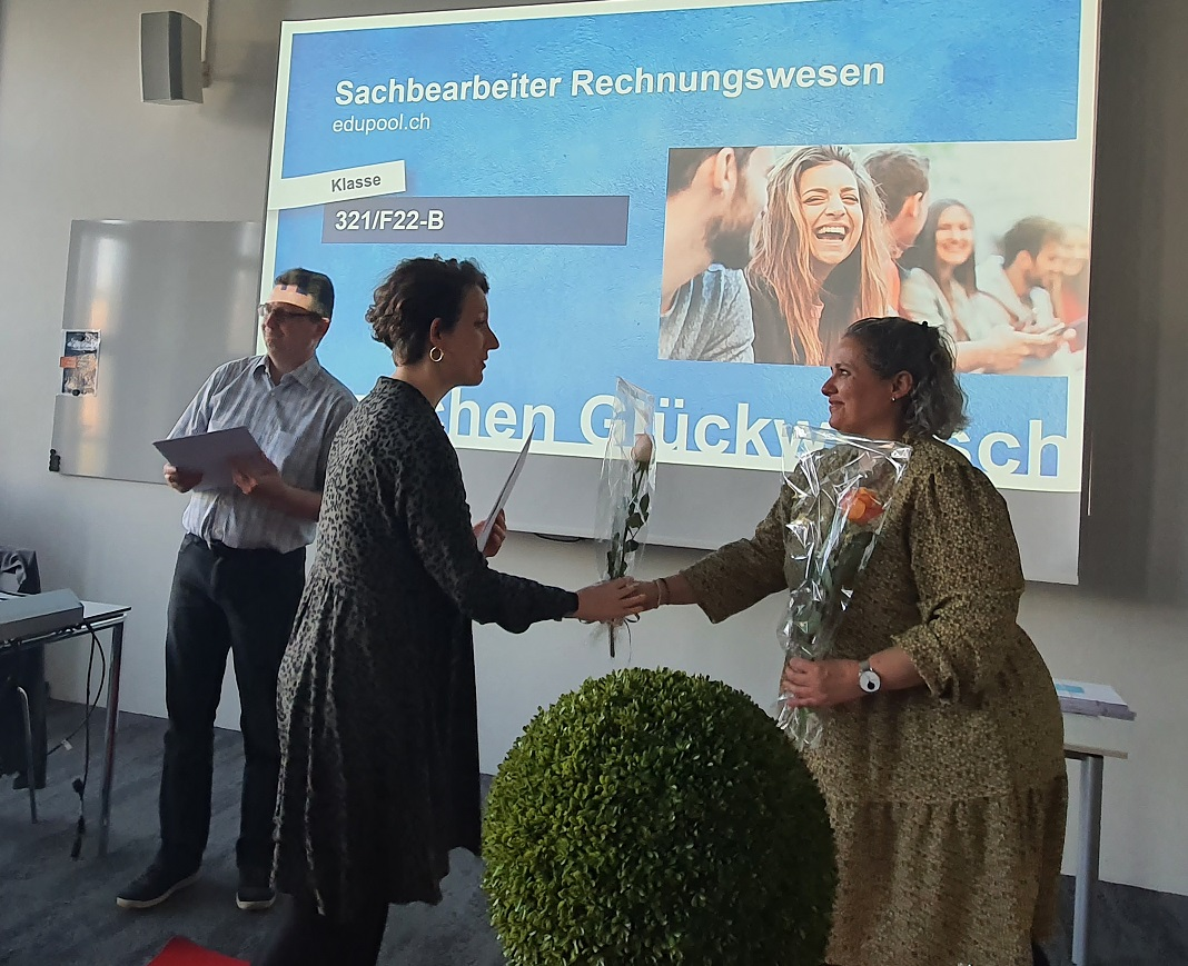 Die erfolgreichen Abschlüsse gehen weiter! Am letzten Freitag durften die Absolventinnen und Absolventen des Lehrgangs Sachbearbeiter/-in Rechnungswesen edupool.ch an der Abschlussfeier das Diplom entgegen nehmen. Auch bei diesem Lehrgang verzeichnen wir national wieder einen Erfolg: Rang 1 und 2 wurden mit der Note 6 durch 2 ehemalige Studierende von uns belegt.