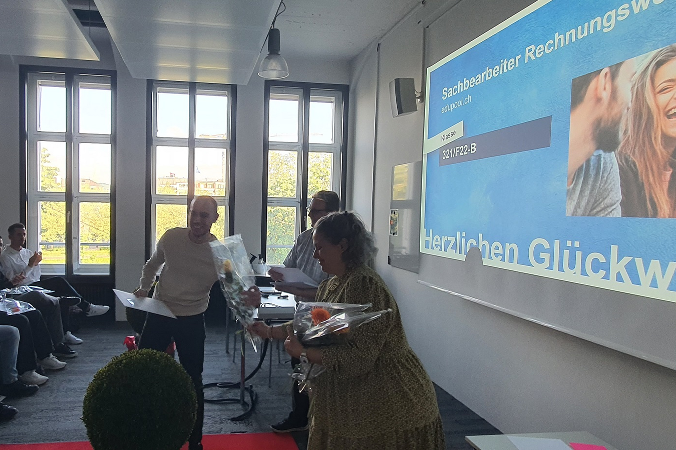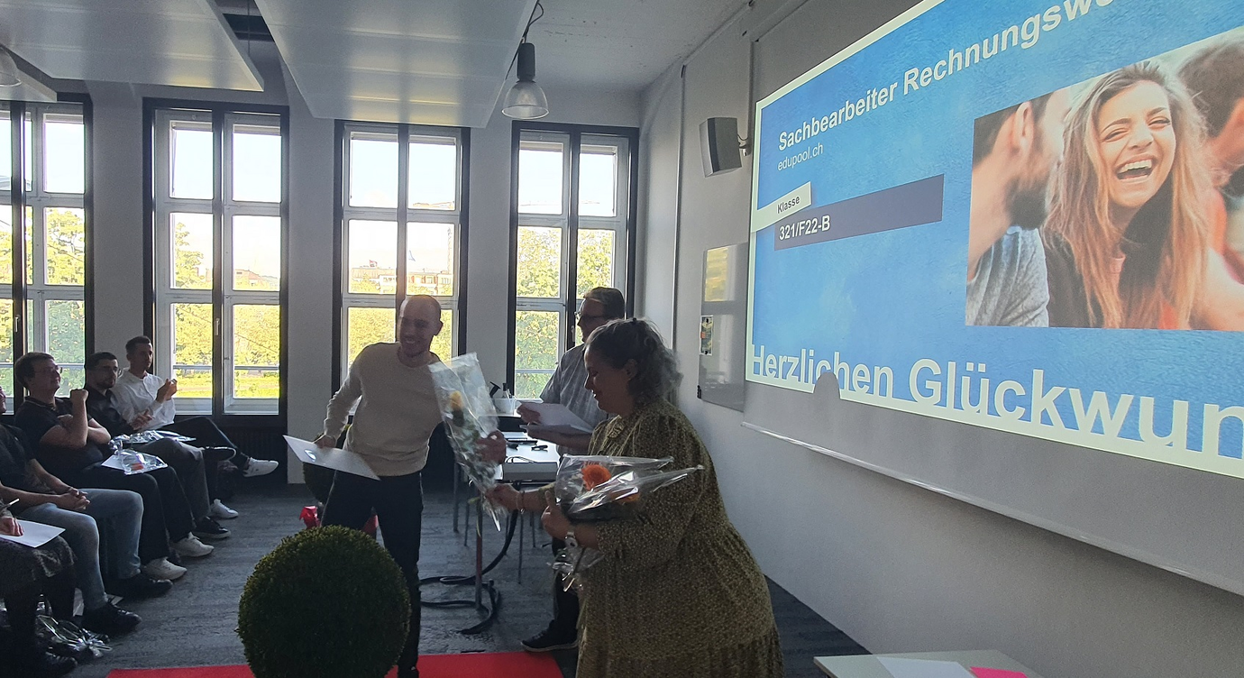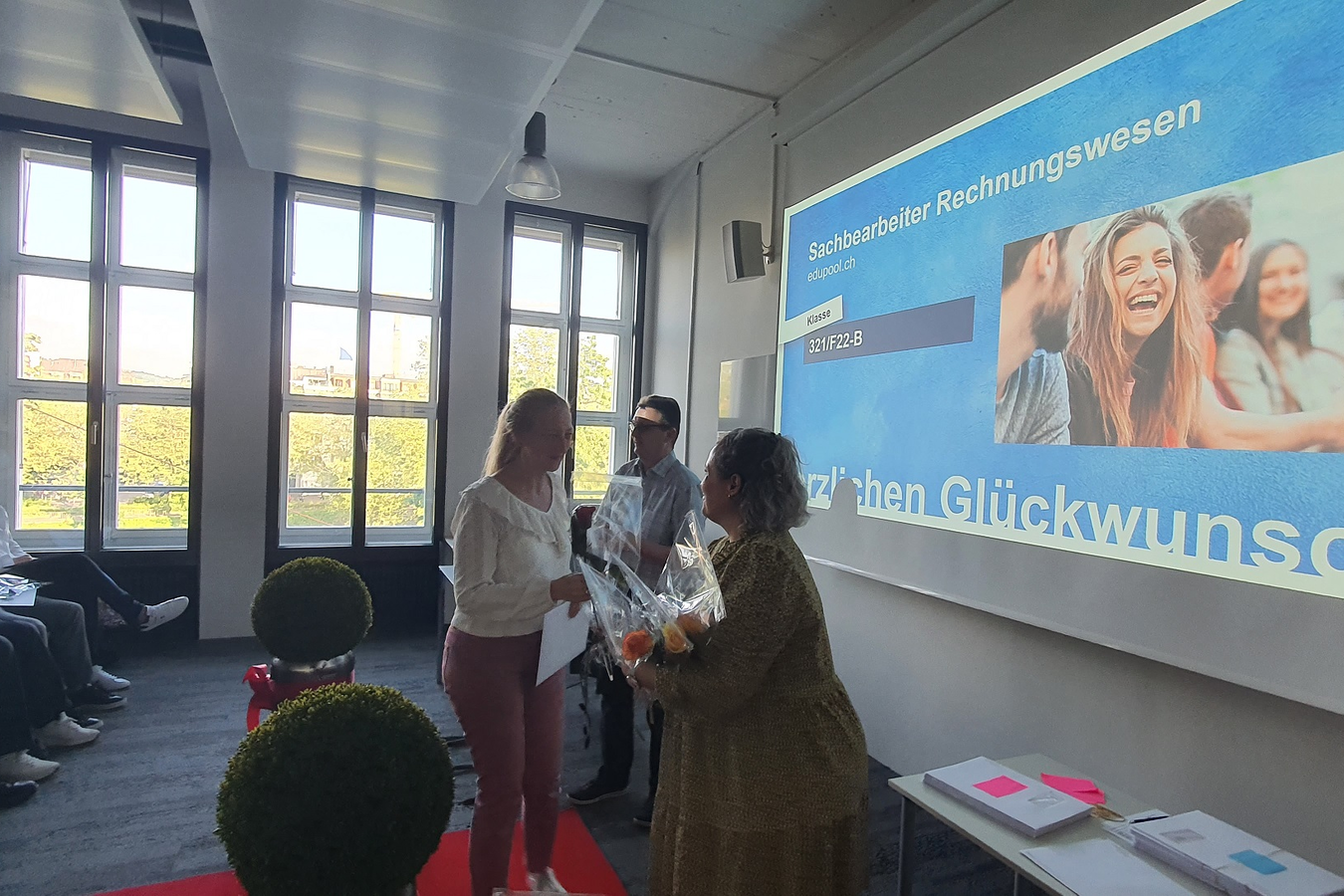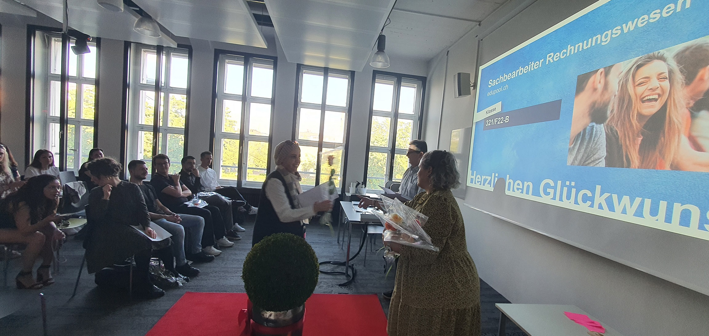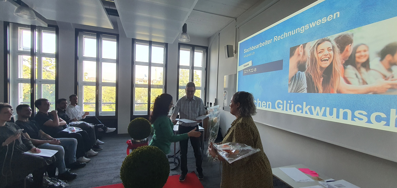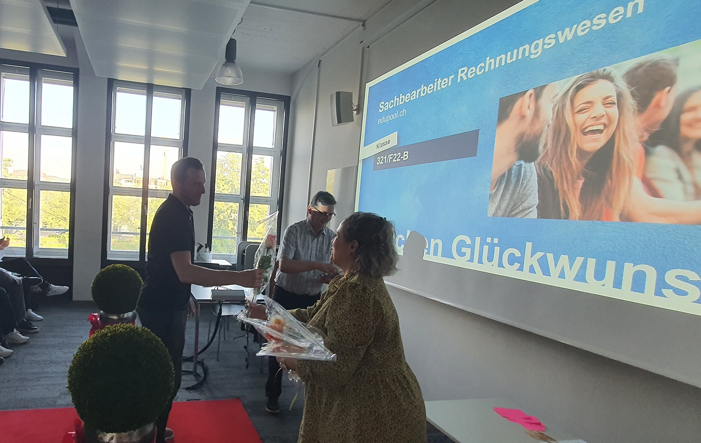 Die erfolgreichen Abschlüsse gehen weiter! Am letzten Freitag durften die Absolventinnen und Absolventen des Lehrgangs Sachbearbeiter/-in Rechnungswesen edupool.ch an der Abschlussfeier das Diplom entgegen nehmen. Auch bei diesem Lehrgang verzeichnen wir national wieder einen Erfolg: Rang 1 und 2 wurden mit der Note 6 durch 2 ehemalige Studierende von uns belegt.